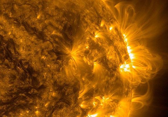 На фото показан активный участок извержения плазмы и появления так называемых «петель» на поверхности Солнца. Эти «петли» являются выбросами заряженных частиц, которые закручиваются вдоль магнитных линий в атмосфере Солнца. Активность в этой области наблюдалась около 40 часов.