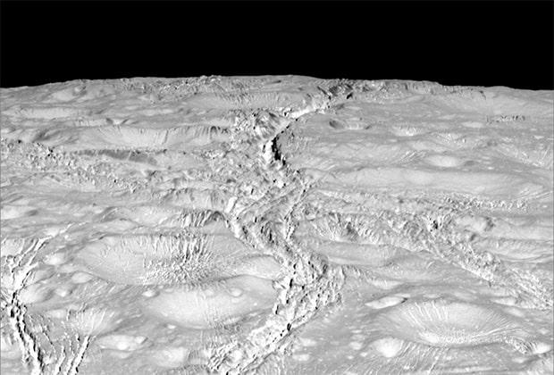 На изображениях заметны три кратера, которые пересекают многочисленные трещины. Ранее миссия Voyager позволила наблюдать такие структуры на поверхности Энцелада, однако полученные ею снимки были плохого качества. Трещины в районе южного полюса и экватора Энцелада ранее фотографировала Cassini.