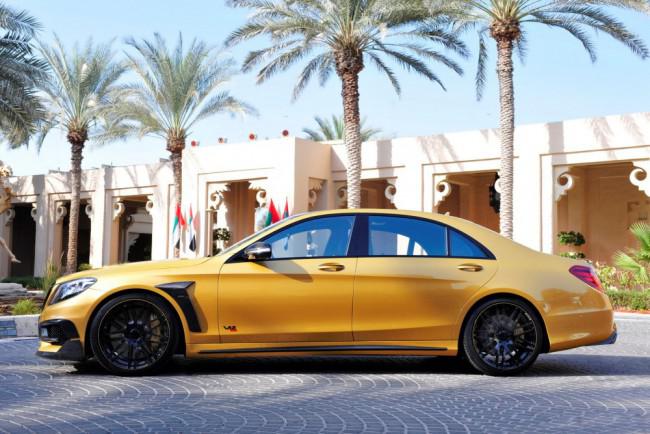Радует глаз и цветовая гамма, в которой оформлен новый “злой” седан от Brabus. Специально для выставки в ОАЭ автомобиль был выкрашен в золотой цвет.