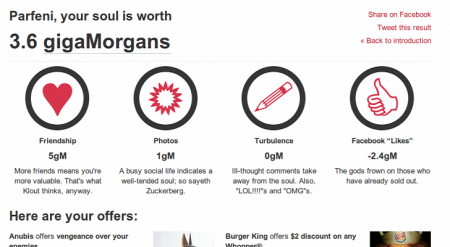 Есть желание продать свою душу? Тогда советуем активнее пользоваться популярной социальной сетью Facebook. Приложение Soul Compare созданное Томом Скоттом предлагает продать вашу душу по весьма выгодной цене. Чем больше друзей и чем больше фотографий вы заливаете на Facebook, тем дороже стоит ваша душа. Набрали много «лайков»? Тогда стоимость души становится ниже. Расчет стоимости осуществляется своеобразной валютой «морганами». Чем больше «морганов» стоит ваша душа, тем более выгодные предложения вы получаете. Никаких шуток, все очень серьезно.
