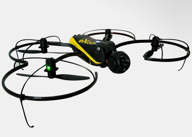 Квадрокоптер под названием eXom представляет из себя коммерческую RTF-систему, которая позволяет собирать и обрабатывать сразу три потока визуальных данных. В головном модуле со стабилизатором установлен тепловизор, камера для трансляции видеопотока и отдельный оптический сенсор для 38-мегапиксельной фотосъемки, который позволяет делать с расстояния в шесть метров снимки разрешением один миллиметр на пиксель. Беспилотник в автономном режиме может передвигаться со скоростью до 28 километров в час, в ручном режиме квадрокоптер развивает скорость до 43 километров в час. Дрон может находится в воздухе до 22 минут и автономно летать при ветре, скорость которого достигает восьми метров в секунду. Дальность связи eXom с пультом достигает двух километров.