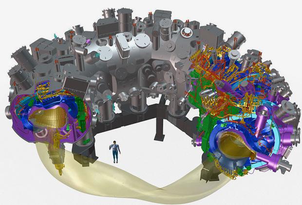 В Германии введен в строй именно стелларатор. Установка Wendelstein 7-X находится в немецком Институте физики плазмы Общества имени Макса Планка в городе Грайфсвальд. Реактор состоит из 50 сверхпроводящих ниобий-титановых катушек около 3,5 метров в высоту и общим весом около 425 тонн, способных создавать магнитное поле индукцией три тесла, удерживающее плазму с температурой 60-130 миллионов градусов Цельсия (это в несколько раз выше, чем температура в центре солнечного ядра). Большой радиус плазмы равен 5,5 метра, малый радиус — 0,53 метра. Объем плазмы может достигать 30 кубических метров, а ее плотность — три на десять в двадцатой степени частиц на кубический метр. Вся конструкция окружена криостатом (прочной теплоизолирующей оболочкой) диаметром 16 метров.