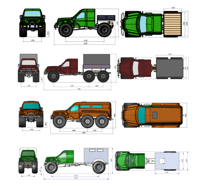Модельный ряд вездеходов МАС включает в себя версию, имеющую колесную формулу 4x4, с кузовом с откидными бортами (МАС −4421"Днепр"), цельнометалический фургон (МАС-6632 «Двина») и модель с тентованным кузовом (МАС-6622 «Березина») с колесной формулой 6x6, а также грузовую версию Кунг с колесной формулой 4x4 (МАС-4425 «Ангара»).