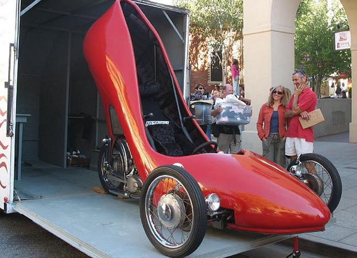 Попыток имитировать туфли на шпильке было огромное множество, начиная от кресла и заканчивая велосипедами и лампами. Но самым интересным вариантом можно считать автомобиль. Хотя стоит отметить, что он больше похож на трёхколёсный мотоцикл.