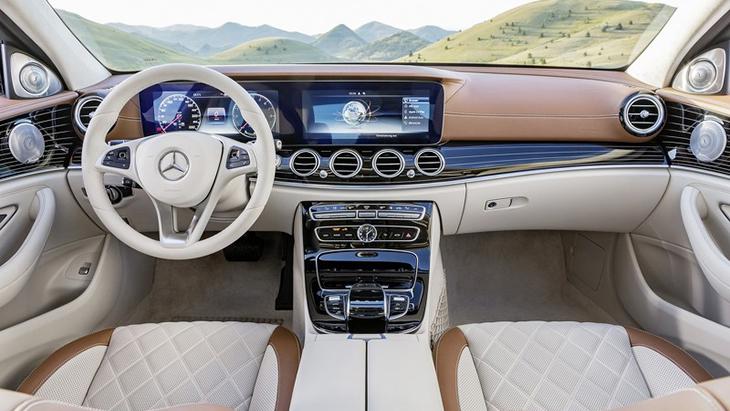 Интерьер E-Class нового поколения был полностью переделан. Теперь топовые версии модели будут оснащены двумя 12,3-дюймовыми дисплеями с разрешением 1920 на 720 пикселей. Первый дисплей выполняет роль цифровой приборной панели, второй отвечает за управление мультимедийной системой автомобиля. У цифровой приборной панели есть три варианта оформления: Classic, Sport и Progressive. В режиме Classic приборная панель выглядит вполне традиционно, с двумя колодцами тахометра и спидометра, между которыми располагается окошко для информации бортового компьютера: расход топлива, запас хода и прочее. В режиме Sport конфигурации приборной панели остаются прежними, меняется лишь размер и цвет шкал и цифр — они становятся крупнее и перекрашиваются в желто-красную гамму. Progressive-режим получился на любителя. Круглый тахометр по центру, вписанный в него цифровой спидометр и море информации справа и слева. Дизайнеры Mercedes-Benz отметили, что при разработке этого режима вдохновлялись хай-теком и фантастикой в духе фильма «Трон».