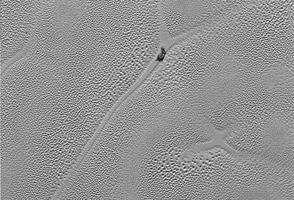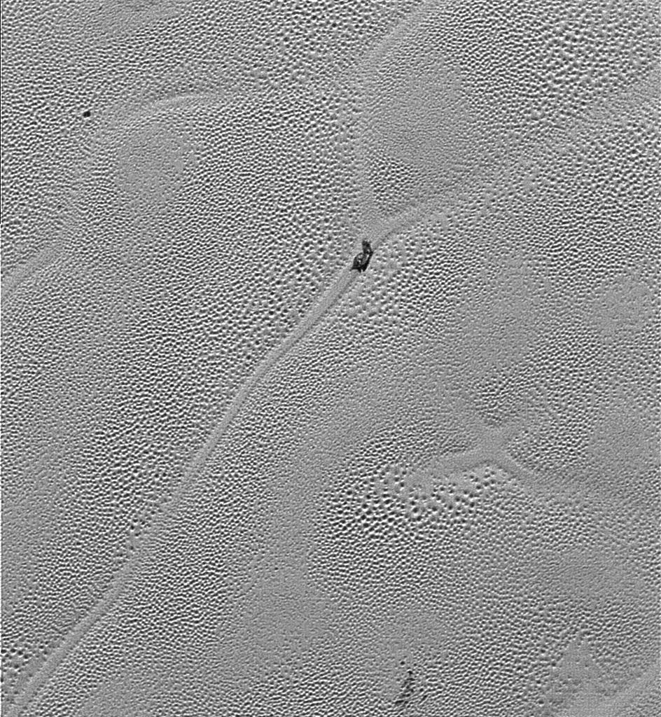 Теперь в центре внимания ученых оказалась равнина Спутника, расположенная в левой части «сердца». Разрешение полученных снимков составило 77–85 м на пиксель. Так что они позволили максимально детально изучить некоторые особенности области Томбо. Одной из самых интересных стал Х-образный объект, расположенный в нижнем правом углу снимка. Странную его форму, по мнению ученых, может объяснить «конвекционная» теория. Согласно ей в азотном льду имели место процессы конвекции. Подобные азотные ячейки периодически возникают, а иногда сливаются друг с другом. При этом такие процессы могут занимать миллионы лет. Так что странный Х-образный объект вполне может быть результатом слияния нескольких конвекционных ячеек.