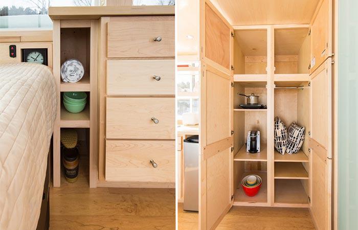 Внутри дома имеется все необходимое. Есть небольшой обеденный столик, рассчитанный на двух человек. Есть «стандартный» современный кухонный набор с плитой, раковиной, полками и шкафом для посуды. Имеется также духовка, холодильник и микроволновая печь. Само собой есть комфортное спальное место, которое «раскладываться» и может трансформироваться из небольшого дивана в кровать.