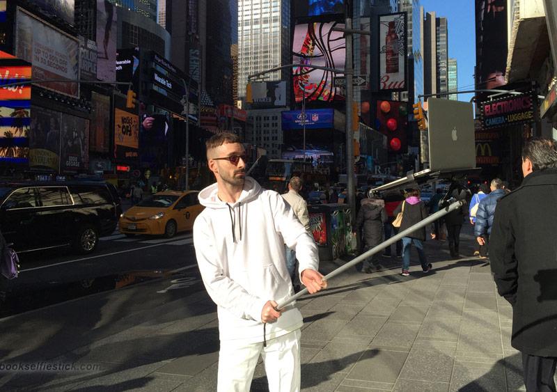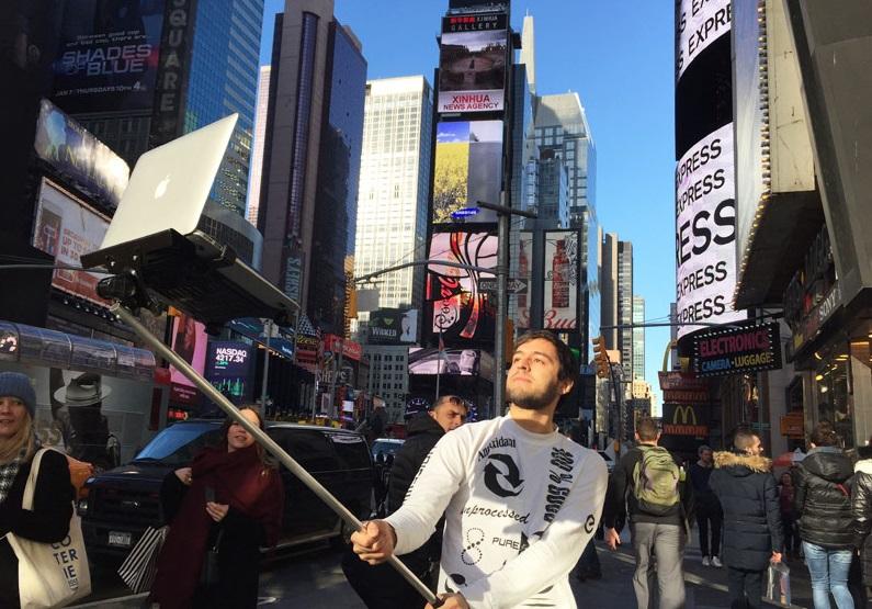 Необычное приспособление привлекает внимание прохожих, они мгновенно замираю, гладя на людей, которые делают слефи на MacBook.