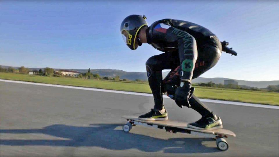 Спортсмен использовал для заезда скейтборд, созданный словенским стартапом Next Generation Vehicles. Доска разрабатывалась в течение двух лет. Она оснащена четырьмя электромоторами (по одну на каждое колесо) и двумя комплектами батарей, которые позволяют проехать без подзарядки от 10 до 15 километров. На полную зарядку аккумуляторов требуется 1,5 часа. Управление скейтбордом осуществляется при помощи беспроводного дистанционного пульта.