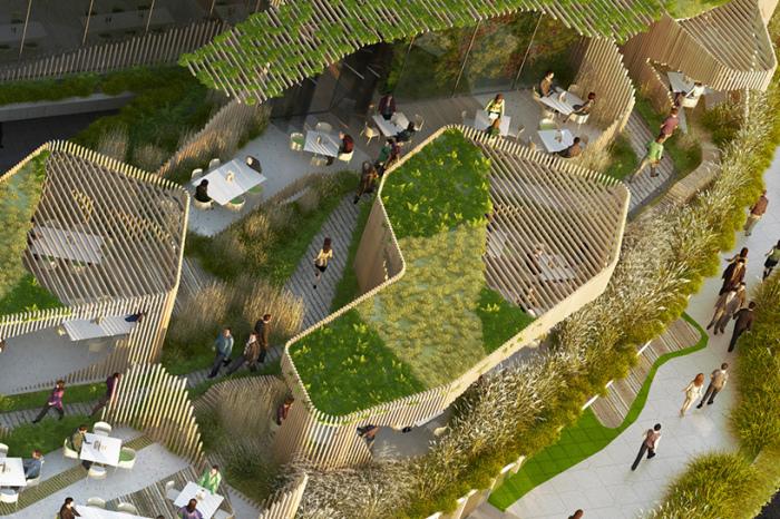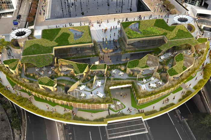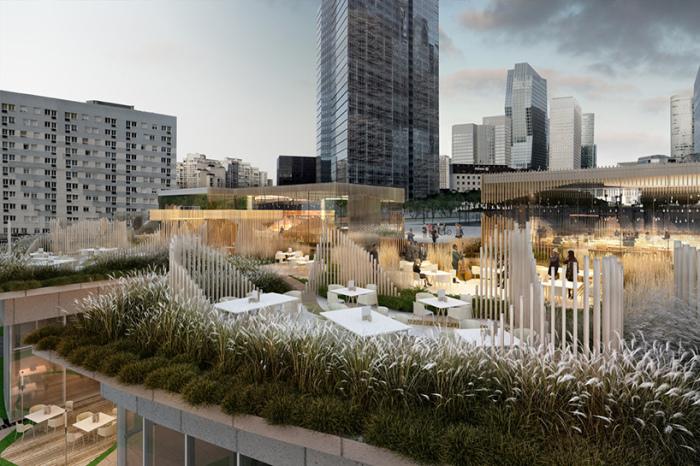Французская студия дизайна Stephane Malka Architecture представила проект под названием OxyGen. Архитектор предлагает построить общественное пространство, представляющее собой синтез кафе, ресторанов, открытых террас и множества зеленых насаждений. Локация будет расположена над автомагистралью и ж/д дорогой на набережной Le Grand Parvis.