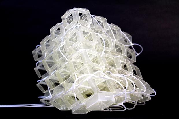 Взяв за основу куб, они сделали прототип механического метаматериала из 64 «строительных блоков». Полученная фигура представляет собой куб 4×4x4, который может легко складываться. Он имеет три степени свободы и при изменении формы также меняет и жесткость. Для своей работы исследователи использовали полиэтилентерефталат (термопластик) и двухсторонний скотч. Изменение формы фигуры осуществлялось с помощью пневматических приводов, которые, фактически, были встроенными надувными карманами. Однако, как отмечают ученые, метаматериалы, в основе которых лежит подобный геометрический принцип, могут также менять свою форму под воздействием тепла, диэлектриков или воды.
