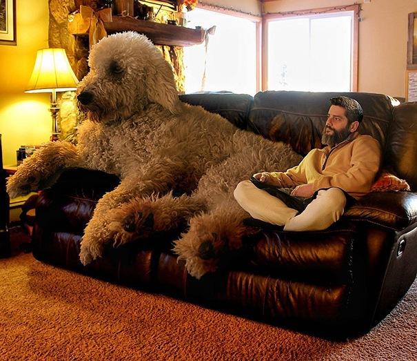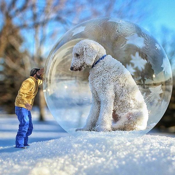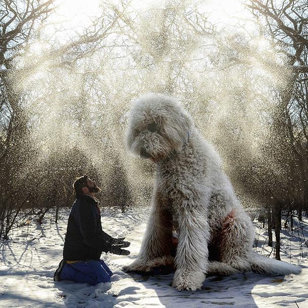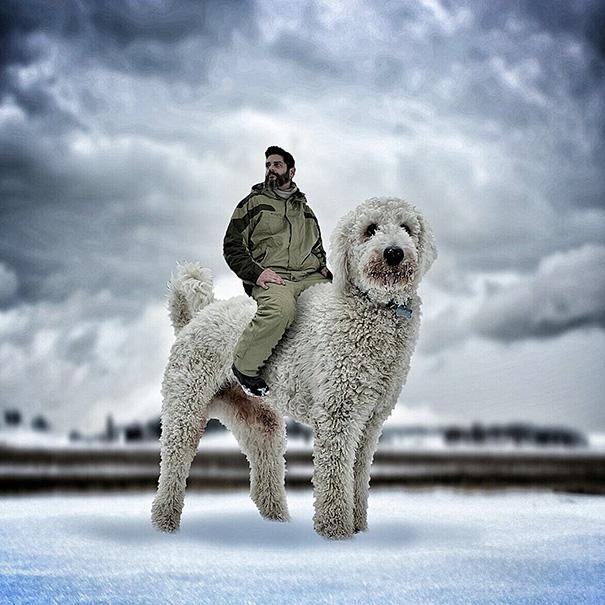 Используя камеру и Photoshop, Кристофер превращает своего небольшого пса в настоящего гиганта, а затем аккуратно вписывает его в различные повседневные сюжеты.