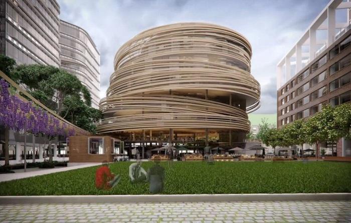 Динамичный фасад мультифункциональной библиотеки буден словно «окутан» деревянными спиралями. Такое архитекторское решение не только выделит здание среди других построек, но и станет своеобразной защитой от палящего солнца. К тому же, «круговая» архитектура будет как бы способствовать активному общению посетителей.