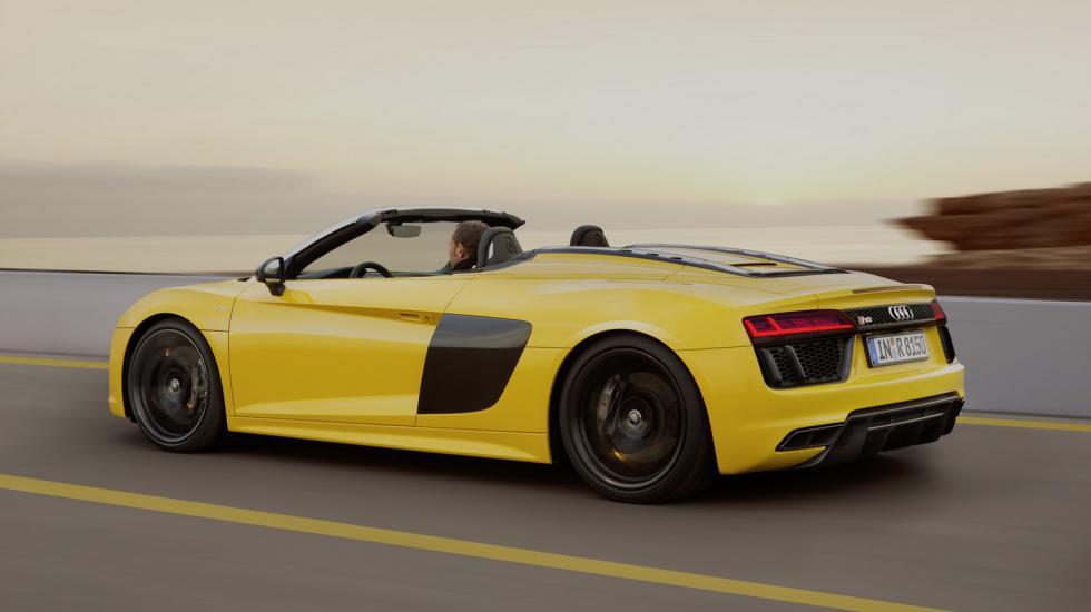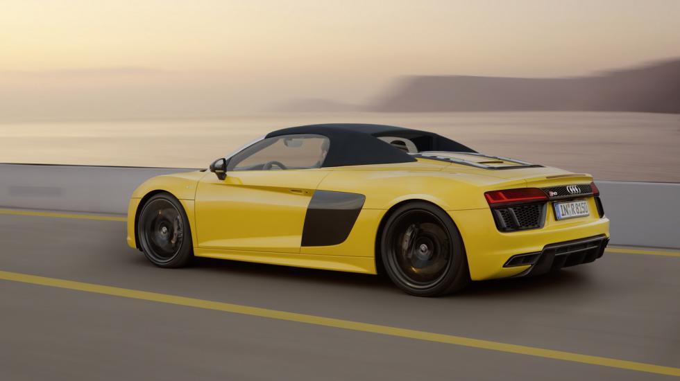 В цифрах расклад такой: тот же атмосферный V10 на 5,2 литра делает 540 сил (версия plus, надо понимать поднажмет до 610) и, вместе с 7-ступенчатой коробкой и полным приводом, разгоняет открывашку до первой сотни за 3,6 секунды (на 0,1 с медленнее “обычной” двухдверки) и до 318 км/ч максимальной скорости. Что до крыши (матерчатой), то опустить/поднять ее можно за 20 секунд и на скорости до 50 км/ч. При этом заднее стекло можно опустить даже при закрытом верхе.