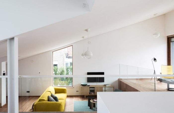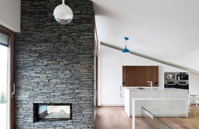 Естественный свет проникает внутрь дома сквозь одно огромное и нескольких аленьких окон. Чтобы интерьер не казался темным, дизайнеры выполнили стены в светлых оттенках. Для отделки помещений были использованы только натуральные материалы.
