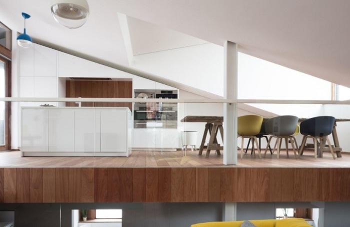 Дом Pibo состоит из двух этажей. На наземном уровне расположены гостиная и кухня, а под землей находятся спальня и ванная. Наклонные потолки не мешают хозяевам чувствовать себя уютно в своем убежище.