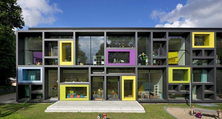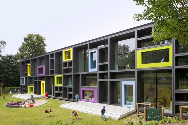 Интересная геометрия фасада сразу же привлекает внимание к детскому саду, контрастное решение с яркими акцентами на фоне графитовой базы приятно радует глаз, поднимая настроение. Внутреннее оформление пространства не менее интересно. Архитекторы создали все условия для комфортного отдыха и творческих игр, поощряя взаимодействие детей. Панорамное остекление открывает обзор зелёной зоны вокруг здания, наполняя помещения солнечным светом, лучи которого подчёркивают сочные краски в интерьере.