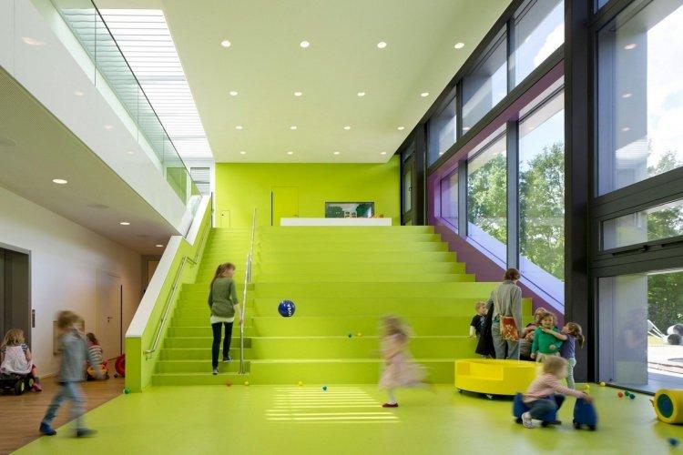 Центральное двухэтажное пространство предназначено для активных игр, различные конструкции стимулируют фантазию и призывают детишек к движению и творчеству. При этом архитекторы позаботились и об укромных уголках, где утомлённые малыши могут спокойно отдохнуть, почитать или порисовать. На первом уровне также спроектированы комнаты для самых маленьких, а наверху расположились дополнительная ясельная группа и два зала для детей постарше. Там же предусмотрены столовая, кухня, мастерская и комната для проведения собраний. Перемещаться между этажами можно посредством лестницы или лифта. Более того, здание детского сада получилось не только функциональным, красочным и гибким в отношении будущих изменений, но ещё и энергоэффективным, за что проект и был награждён золотым сертификатом качества.