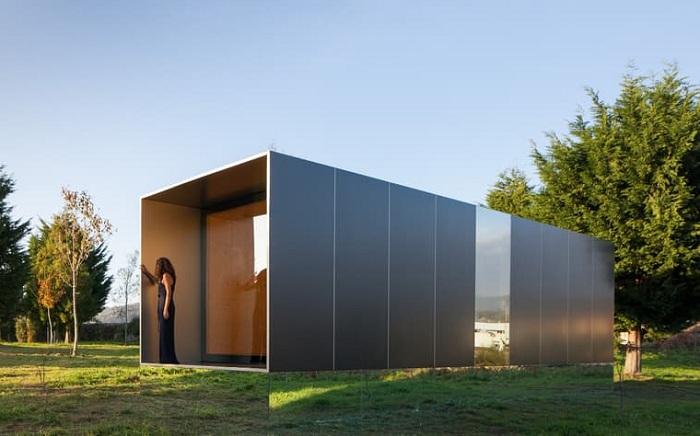 Снаружи дом отделан листами алюминия. Под ним находятся сэндвич-панели и кросс-ламинированные панели древесины между которыми расположен слой изоляции. Внутренняя обшивка выполнена из лакированной древесины.