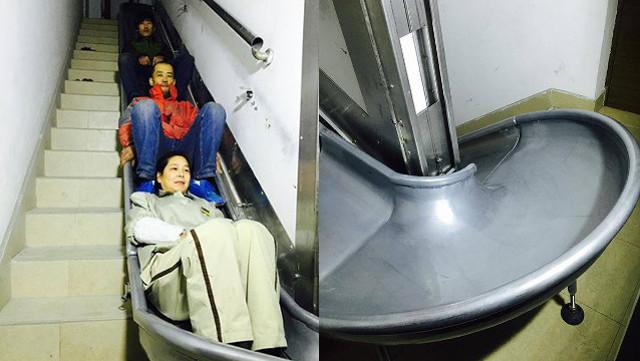 По словам изобретателя, горки из нержавеющей стали и алюминия сделают процесс спуска на нижние этажи быстрым и простым для пожилых людей. Чжоу заявляет, что, скользя по горке, вы затратите 2-3 секунды на один пролет.