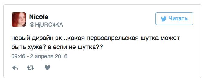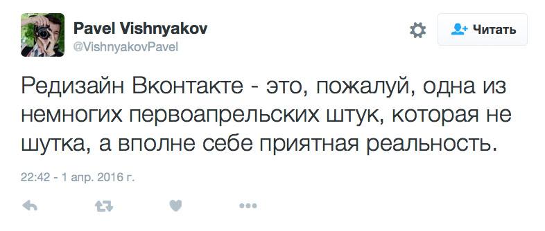 Пользователи соцсети начали активно обсуждать нововведения: «Тестим новый дезигн конташки! На первый взгляд, уютно! Ждём альтернативных лайков, аля Лицокнига», «Вконтакте» редизайн обрадовал многих», «Коротко про новый дизайн #вконтакте немного не привычно, но в принципе всё неплохо, верните только квадратные аватарки-иконки!», «Смесь #Инстаграм’а и #ФБ, ну и, конечно же, собственно придуманные фишечки», «Редизайн Вконтакте – это, пожалуй, одна из немногих первоапрельских штук, которая не шутка, а вполне себе приятная реальность».