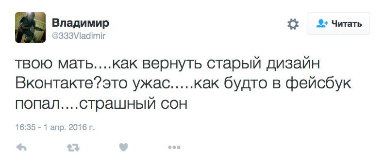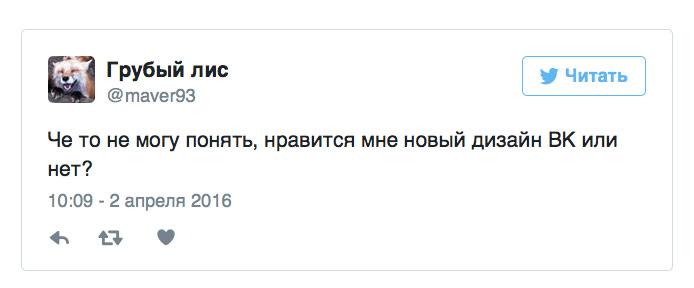Однако далеко не все комментарии носят позитивный характер: «Новый дизайн во „ВКонтакте“, это полный бред. Сами ничего придумать не можете? Просто нет слов», «редизайн ВК просто ужасный», «Новый дизайн #вконтакте, как чужие очки с диоптриями».