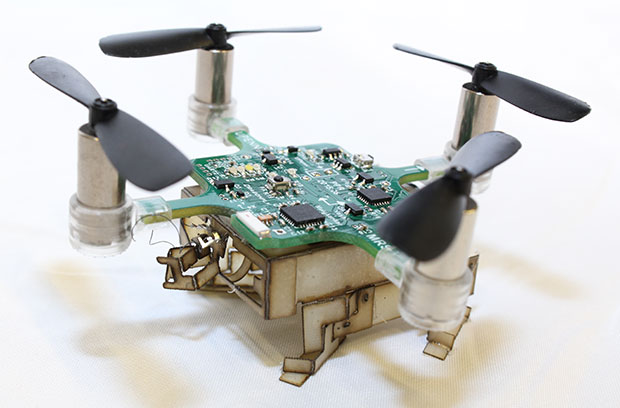 Робот под названием Picobug представляет собой небольшой квадрокоптер весом 22 грамма, дополнительно оснащенный шагающим шасси. Общий вес конструкции составляет 30 граммов. Шагающий квадрокоптер может ходить по плоской поверхности со скоростью до 0,16 метров в секунду, а в воздухе развивает скорость до 6 метров в секунду.