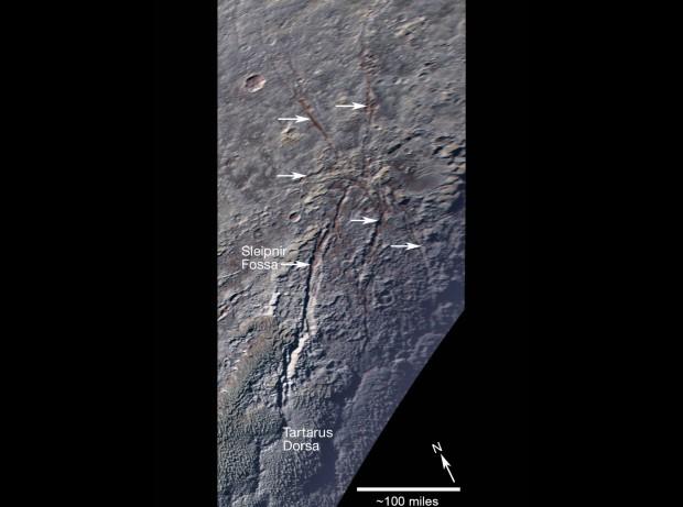 Геологи миссии New Horizons отмечают, что подобные объекты не были найдены ни на одном из тел Солнечной системы кроме Плутона. Согласно официальным данным, самая крупная трещина находится в северной части Плутона и имеет приблизительную длину в пятьсот восемьдесят километров. Протяженность трещин, которые обнаружили специалисты из агентства NASA, составляет всего сто километров.