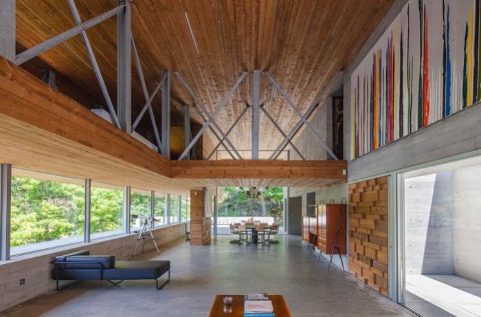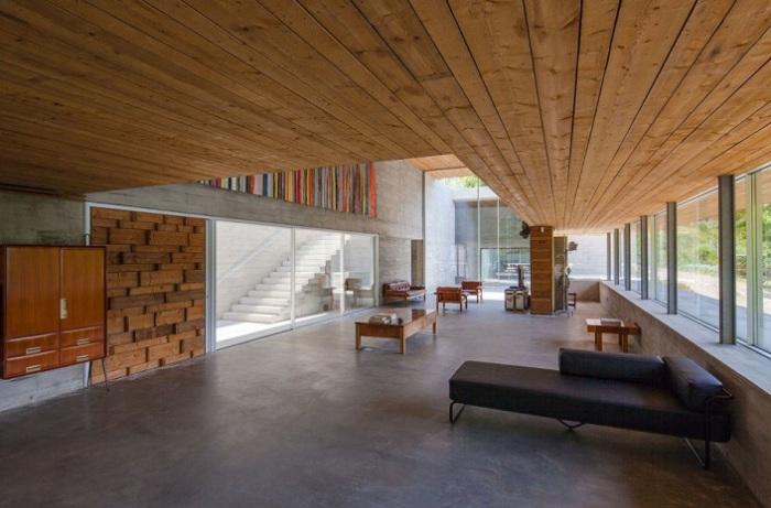 Внутри дома доминируют бетон и натуральная древесина. Широкие окна позволяют естественному свету беспрепятственно проникать внутрь дома. Интерьер не менее лаконичен, чем фасад дома. Никаких лишних предметов декора, только простота четкость линий.