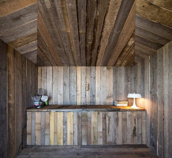 Дома выполнены из переработанной древесины. В одном из них расположена спальня и душ, а во втором спроектированы гостиная и небольшая кухня.