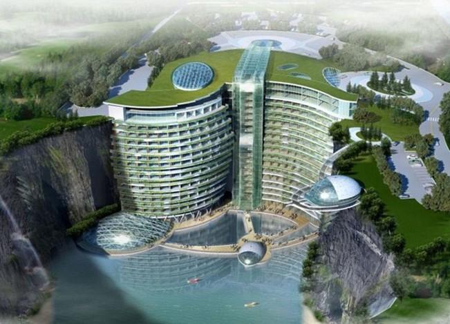Новый отель InterContinental Shimao должен появиться в китайском районе Сунцзян, в 50 километрах от Шанхая. Здание, спроектированное британской компанией Atkins, расположится в старой неиспользуемой каменоломне глубиной 100 метров, причем часть внутренних помещений разместится в глубине скалы, в искусственных пещерах. Почти все этажи гостиницы будут располагаться ниже уровня земли.