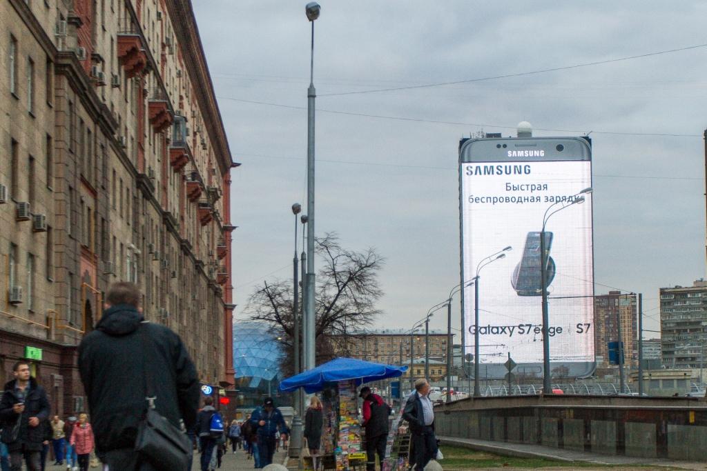 Его размеры составляют 48х80 метров, а площадь экрана - 3 980 квадратных метров. Посмотреть на него может любой житель и гость Москвы. Речь идёт о самом большом медиафасаде на здании Гидропроекта, который Samsung превратила в увеличенную копию флагмана Galaxy S7 Edge.