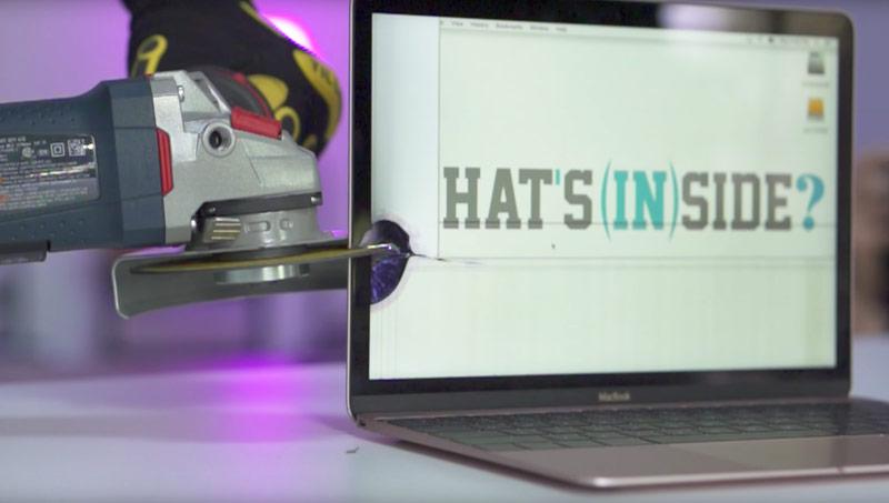 В самом начале ролика демонстрируется полностью работоспособный гаджет. Они рассказывают о характеристиках розового MacBook и сравнивают его с MacBook Pro. «Посмотрим, что у него внутри», – говорит один из энтузиастов и приступил к распиливанию экрана болгаркой. Сделав небольшой пропил, ведущий замечает, что ноутбук все еще работает – показывает изображение. «Но не будем останавливаться на достигнутом», – произнес энтузиаст и завершил начатое.