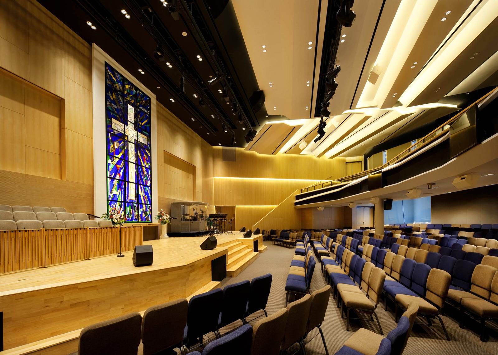 Основные залы для посетителей церкви расположены в сердце здания на 2 и 3 этажах. А ещё выше на 4 и 5 уровнях находятся образовательные пространства, которые также имеют выход на террасу и наружные игровые зоны на крыше.