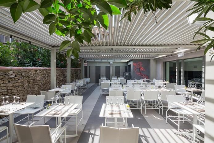 Изящная терраса под навесом в дальней части ресторана позволяет посетителям принимать пищу на свежем воздухе.