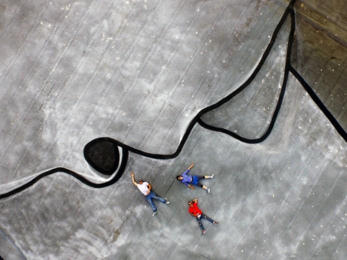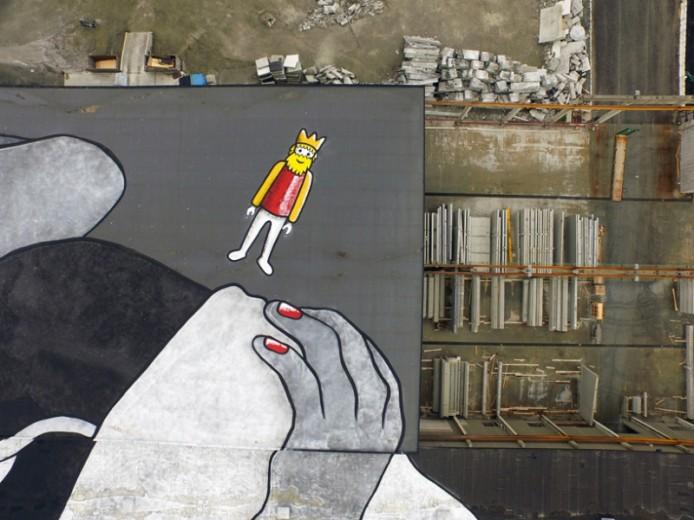 Мурал, нарисованный на крыше промышленного здания, изображает огромную фигуру спящей свернувшейся в клубок женщины. Дама явно современная, поскольку одета в шорты и майку, а ее ногти окрашены в красный цвет.