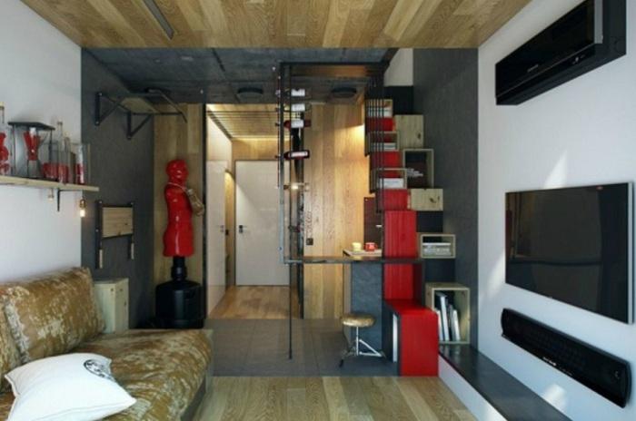 Чтобы иметь возможность оставить центральное пространство свободным, дизайнеры постарались задействовать каждый метр по периметру квартиры. Ступени, которые ведут к спальне, выполняют также функцию ящиков для хранения. Место для приготовления еду представляет собой плиту и небольшую разделочную поверхность.