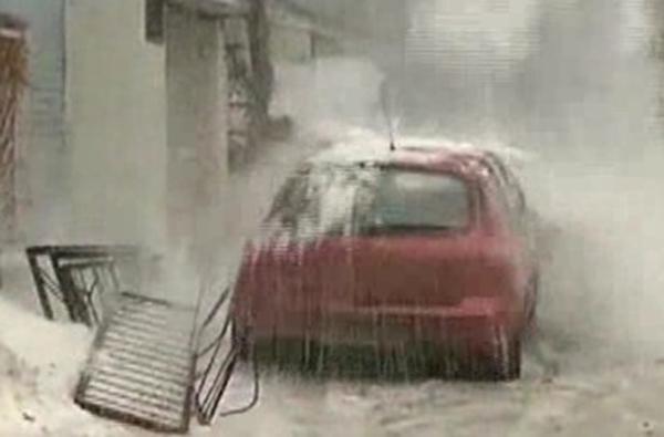 Как передает tsn.ua, с козырька здания сорвалась металлическая ограда, которая не выдержала навалившуюся на нее снежную массу и в результате на машину обрушилась огромная глыба льда.