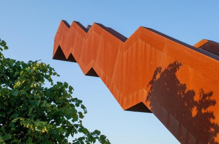 Каркас выполнен из оцинкованной стали. В качестве обшивки использована красно-коричневая кортеновская сталь. Выбранный цвет также является отсылкой к железняку, который добывается в провинции. К тому же «ржавый» оттенок конструкции прекрасно сочетается с естественным ландшафтом.