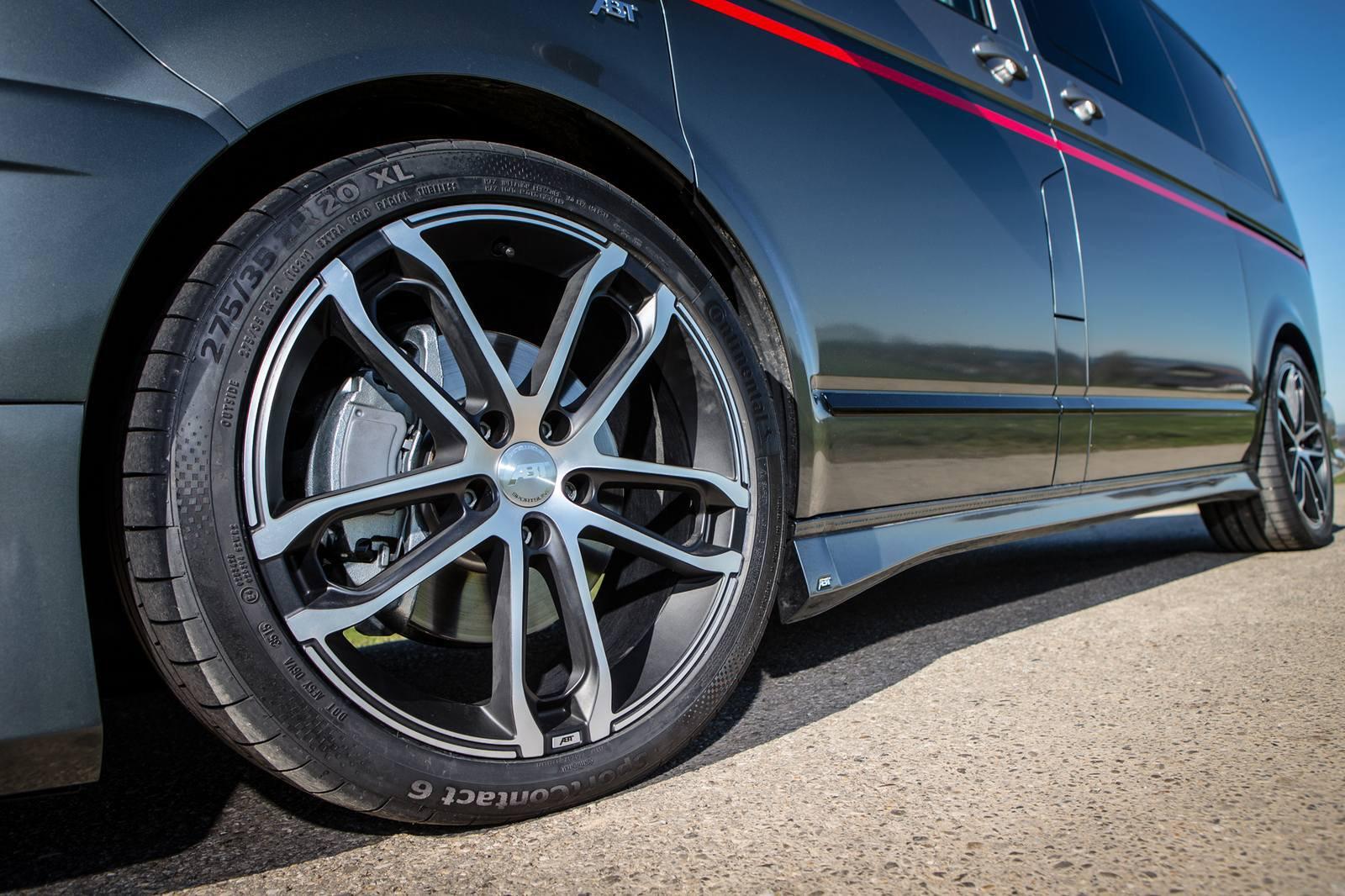 Большую роль в новом дизайне сыграли новые части кузова. Юбилейный Transporter выглядит более динамично. Мини-вэн оснастили новыми элементами переднего бампера, новой решёткой радиатора и боковыми юбками. В задней части авто появилось новое антикрыло и фирменный выхлопной комплект ABT с четырьмя глушителями. Последний элемент, с которым Volkswagen T6 стал выглядеть абсолютно по-другому – это новые диски. Комплект больших кастомных дисков команде ABT предоставила компания DR.