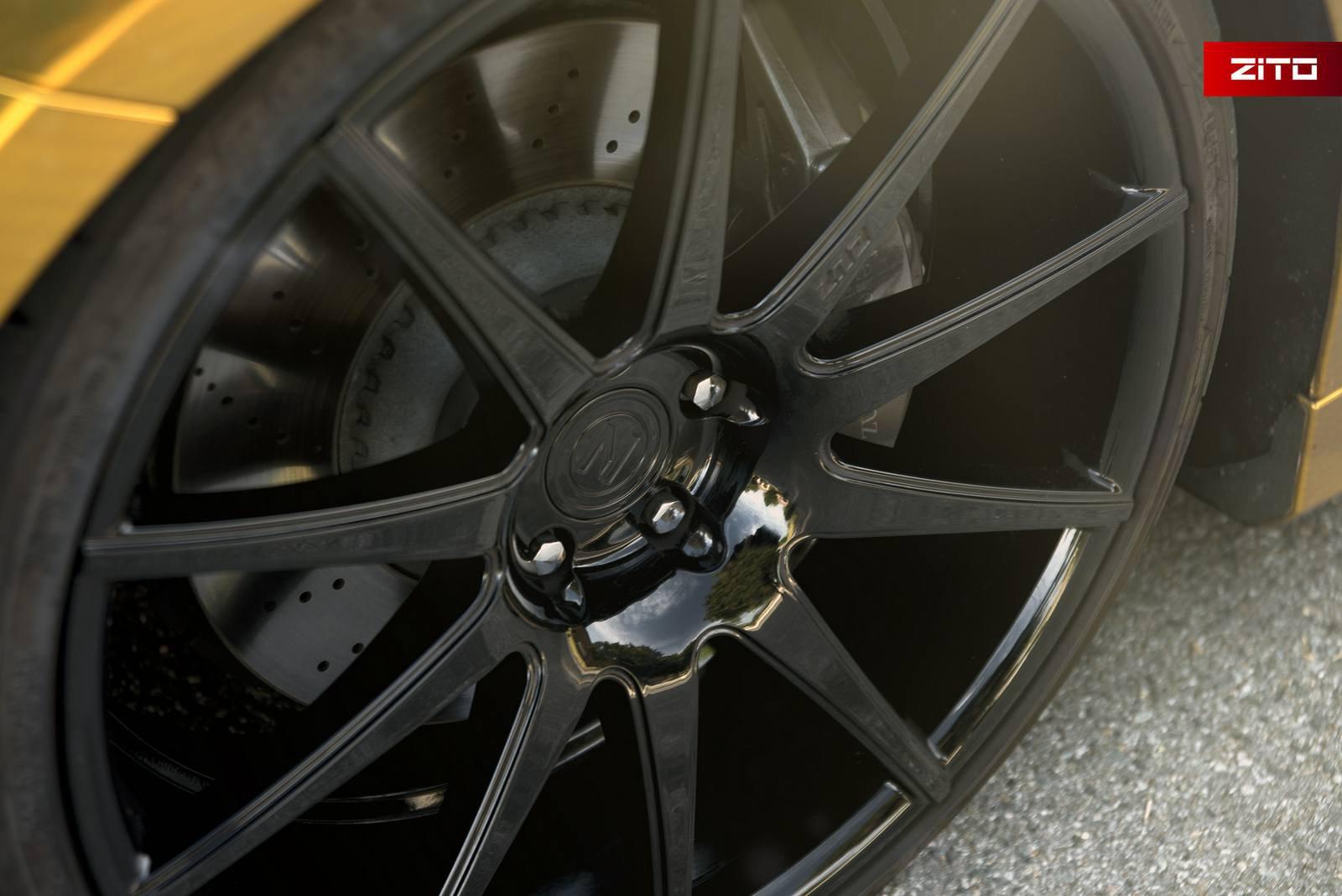 Хотя издалека автомобиль кажется полностью золотым, при ближайшем рассмотрении взору открывается кастомный принт Hexis, окутывающий весь корпус авто. Принт придаёт дизайну абсолютно новое настроение и подчёркивает новые чёрные диски. Комплект ZS03 произведён компанией Zito Wheels и включает в себя передние диски габаритами 21/9 и задние размерами 21/10,5. Наконец, новый сет дисков дополняется шинами Toyo T1R габаритами 255/30/21 и 295/25/21 на передней и задней оси соответственно.