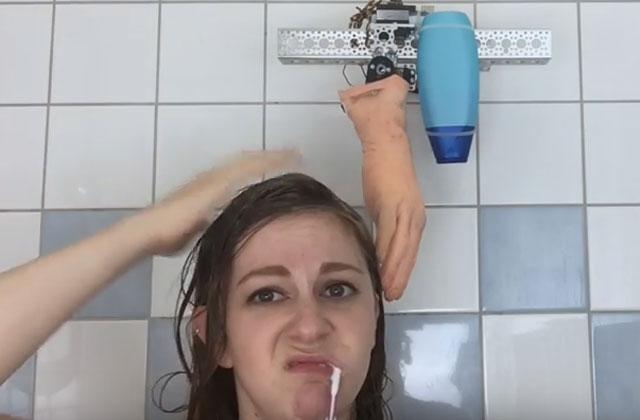 В основе изобретения лежит аппаратная платформа Arduino Uno. К ней изобретательница подключила два сервопривода. Один выдавливает шампунь из бутылки, а второй приводит в движение искусственную руку, которая вспенивает волосы.Робот работает от встроенного аккумулятора. Чтобы избежать удара током, используется рука из резины. Устройство крепится к стене с помощью присоски.