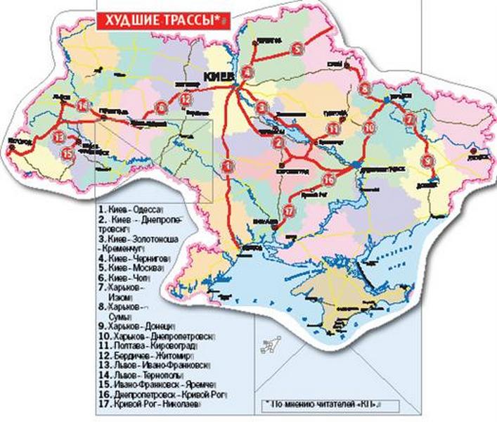 "В Украине есть одна автомобильная дорога: Киев - Борисполь, - выразил общее мнение один из читателей. - Догадываетесь, почему? Все остальные - полигоны для проверки ходовой части наших автомобилей. Так что определять худшую дорогу смысла нет, ибо нет нормальных!"