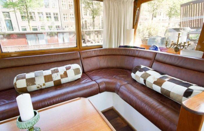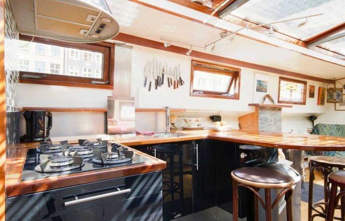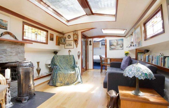 Прихожей плавучего дома служит капитанская рубка, через которую можно попасть в гостиную. На борту имеется полноценная кухня, две спальни, камин и санузел. На палубе обустроена небольшая терраса для отдыха со столиком и живыми цветами.