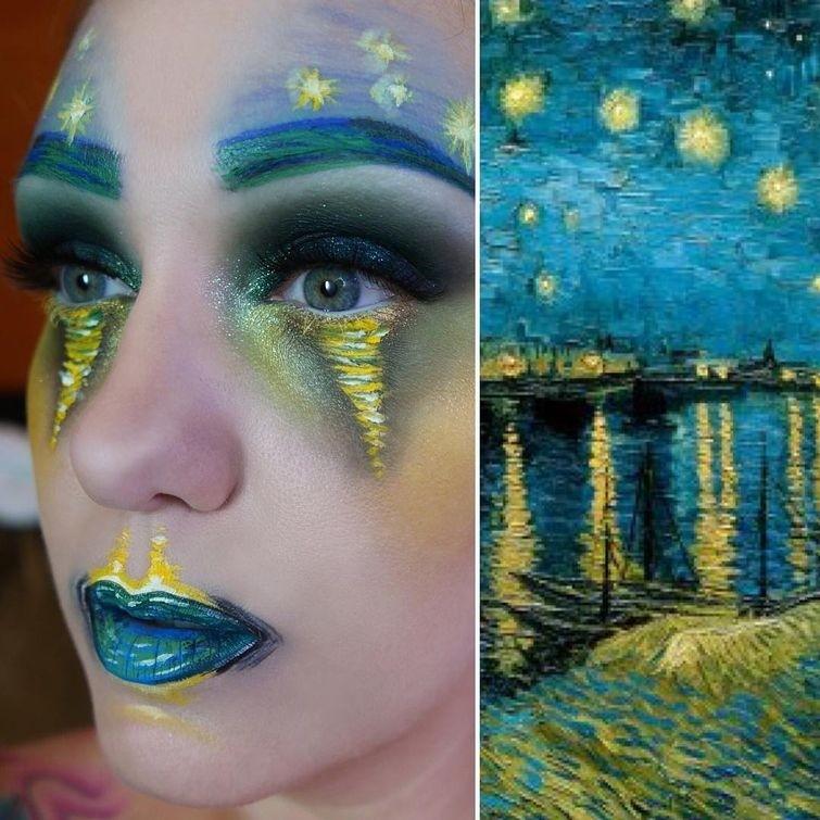 Её лицо превращается то в картины Ван Гога, то напоминают работы Густава Климта или абстракцию Пабло Пикассо.