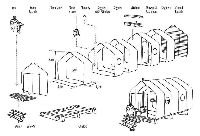 Идея Wikkelhouse заключается в модульной сборке. Дома собираются из сегментов 4,5х3,5х1,2 метра, весом 500 кг — заказчик и будущий владелец выбирает количество и вид сегментов и проектирует помещение по своему усмотрению. Можно сделать большую кухню или запланировать две ванны, также есть вариант застекленного фасада.