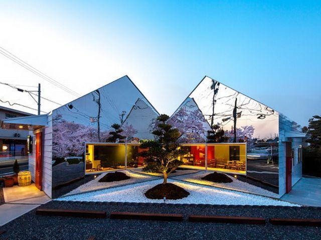 Кафе Mirrors в Японии – еще одно здание, наружная часть стен которого отделана зеркальными панелями. Само заведение ничего особенного не представляет, но на период цветения сакуры превращается в крайне популярное место.