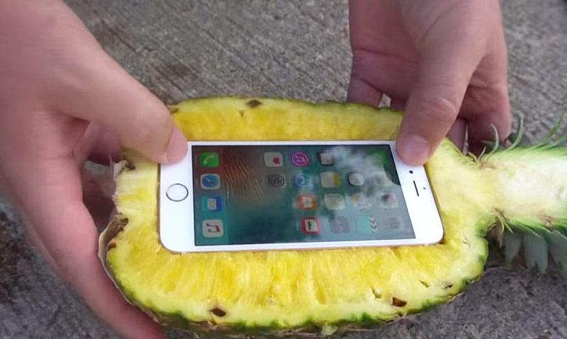 После падения с высоты 30 метров оказалось, что ананас разлетелся на множество кусочков, в то время как у iPhone только треснул экран. Смартфон остался в рабочем состоянии.