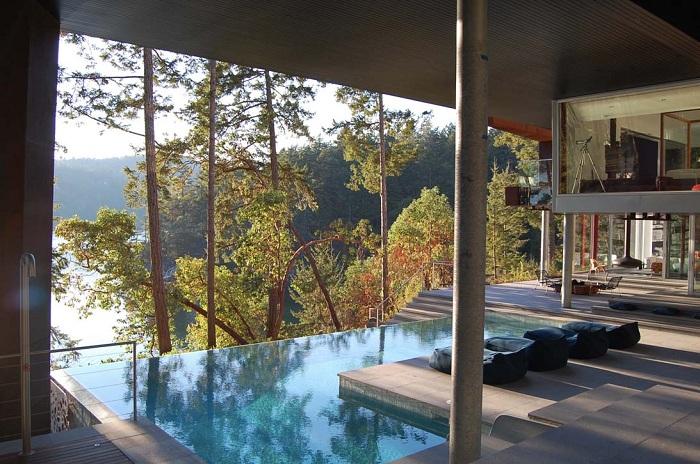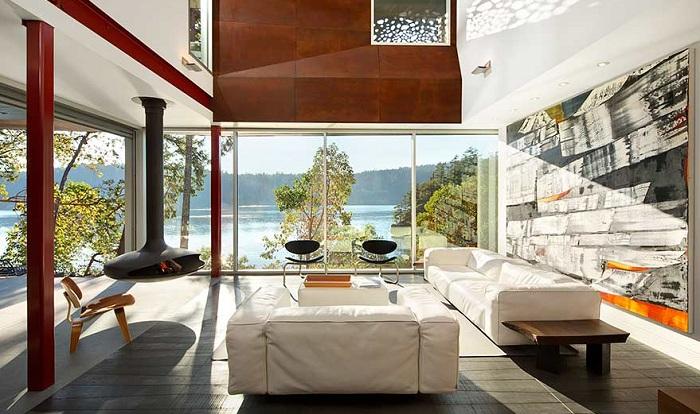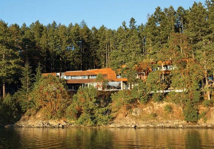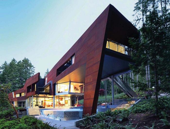 Студия AA Robins Architect реализовала строительство жилого особняка, расположенного на острове Галф, недалеко от Ванкувера. Кортеновская сталь и четкая геометрия на удивление гармонично вписались в окружающий ландшафт. К тому же доминирующие оттенки белый, серый и красный прекрасно сочетаются в естественной среде.