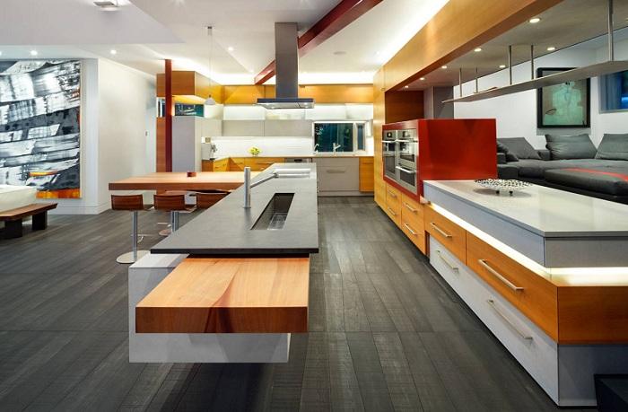 На первом этаже находится кухня и столовая, а основное жилое пространство расположено наверху.